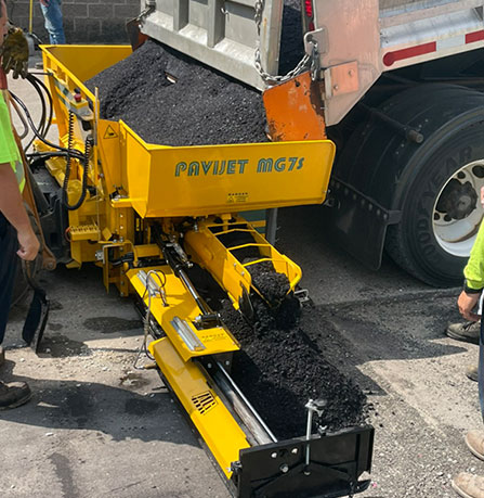 This demonstration shows the Pavijet mini asphalt paver restoring a milled curbside in a tight-access municipal jobsite. The compact design allows crews to pave efficiently without oversized equipment.